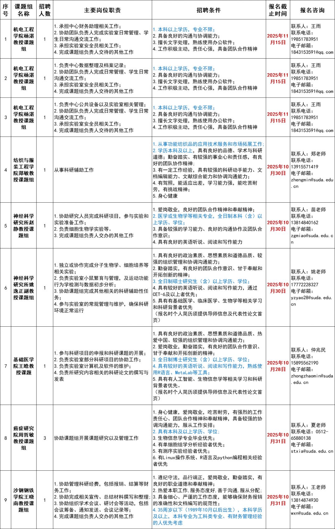 本次共7个课题组公开招聘11名科研助理,招聘岗位具体要求及工作职责等信息详见《苏州大学科研助理招聘岗位表》(见附件1)。