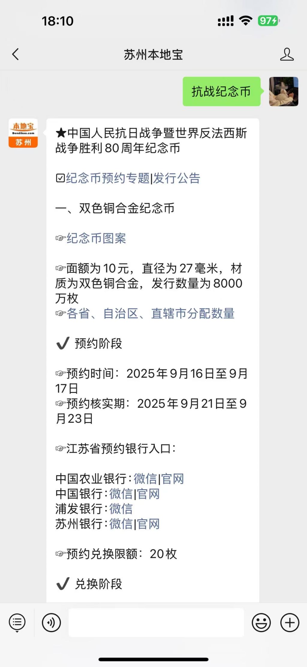 温馨提示:微信搜索公众号【苏州本地宝】,关注后在对话框回复【抗战纪念币】即可获得抗战纪念币图案、预约时间、各银行预约入口、兑换时间、兑换银行网点等信息。
