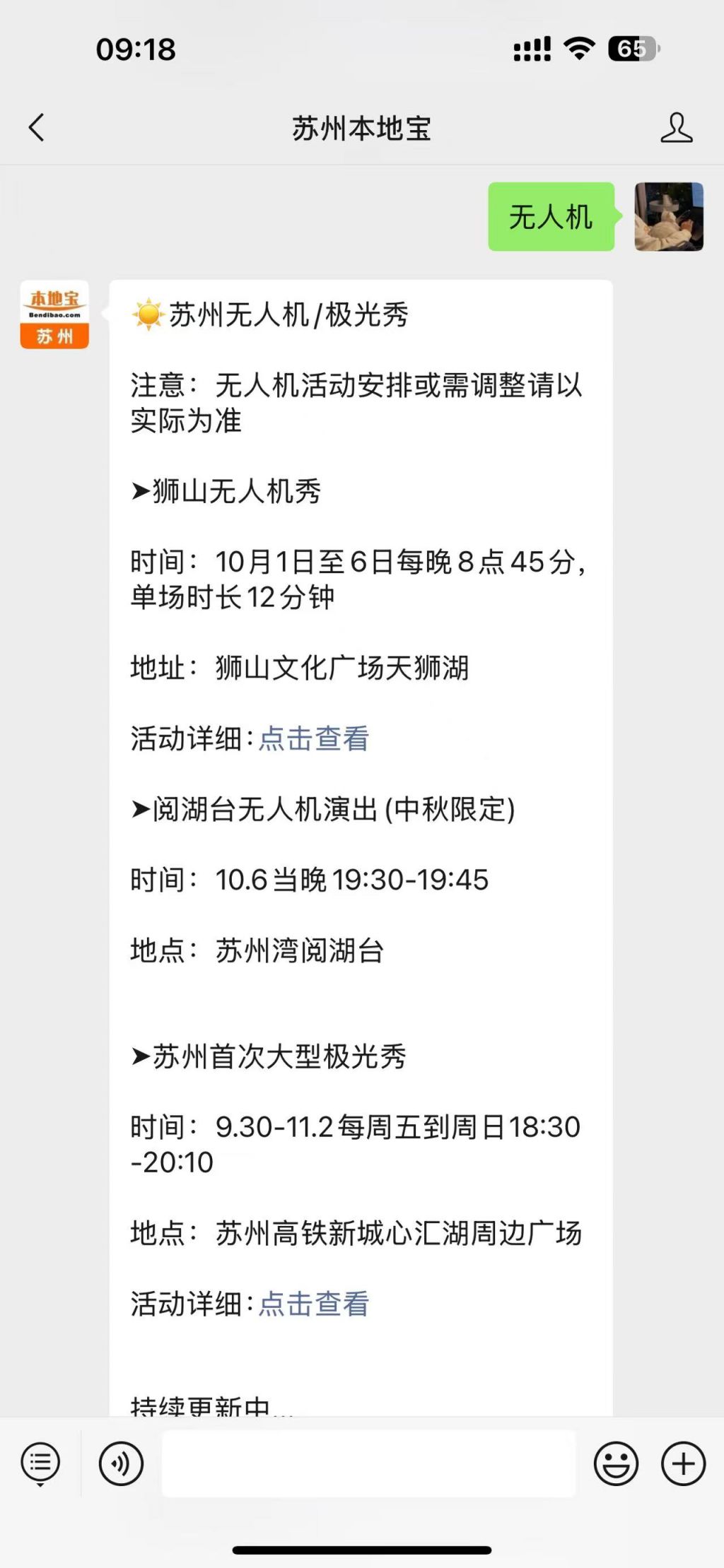 温馨提示:微信搜索公众号【苏州本地宝】,关注后在对话框回复【无人机】即可获得2025苏州国庆中秋无人机活动举办时间、地点等信息。